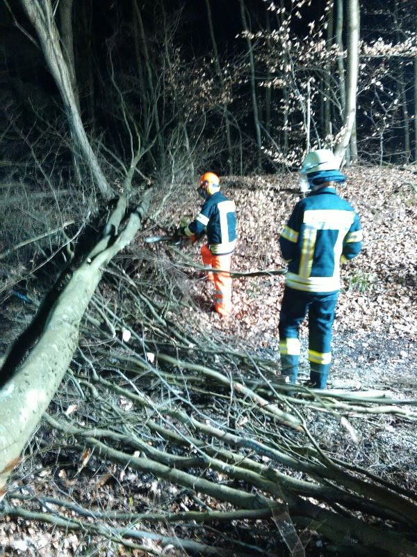 Das Thema der Übung war ein Waldunfall - eine Person wurde bei Baumfällarbeiten unter einem Baum eingeklemmt. Vor Ort fand der Gruppenführer einen Waldarbeiter vor, der ihm von dem Geschehen berichtete und ihm die Unfallstelle zeigte. Der direkte Weg zum Unfallort war durch einen weiteren gefällten Baum versperrt. Es wurde nun die verletzte Person von der Feuerwehr betreut, Beleuchtung aufgebaut, sowie ein Bereitstellungsraum geschaffen.