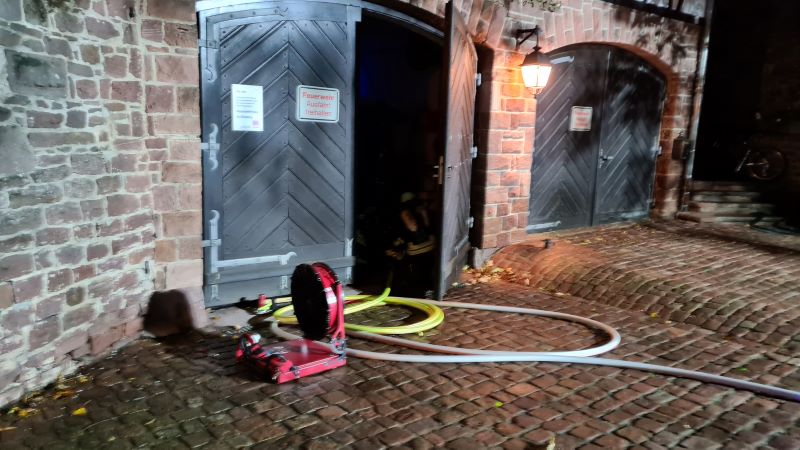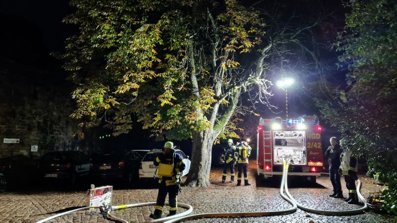 Unsere Fahrzeughalle diente bei der heutigen Übung als Hobbywerkstatt, in der bei angenommenen Schweißarbeiten ein PKW in Brand geriet. Auf der Rückseite des Gebäudes schlugen die fiktiven Flammen aus den Fenstern, so dass auch dort neben der Beleuchtung noch ein Löschangriff aufgebaut wurde.