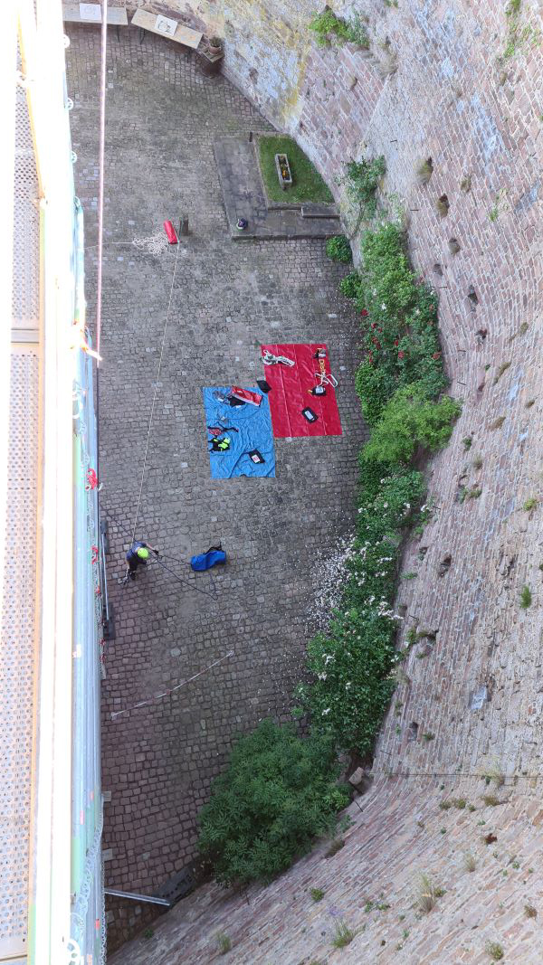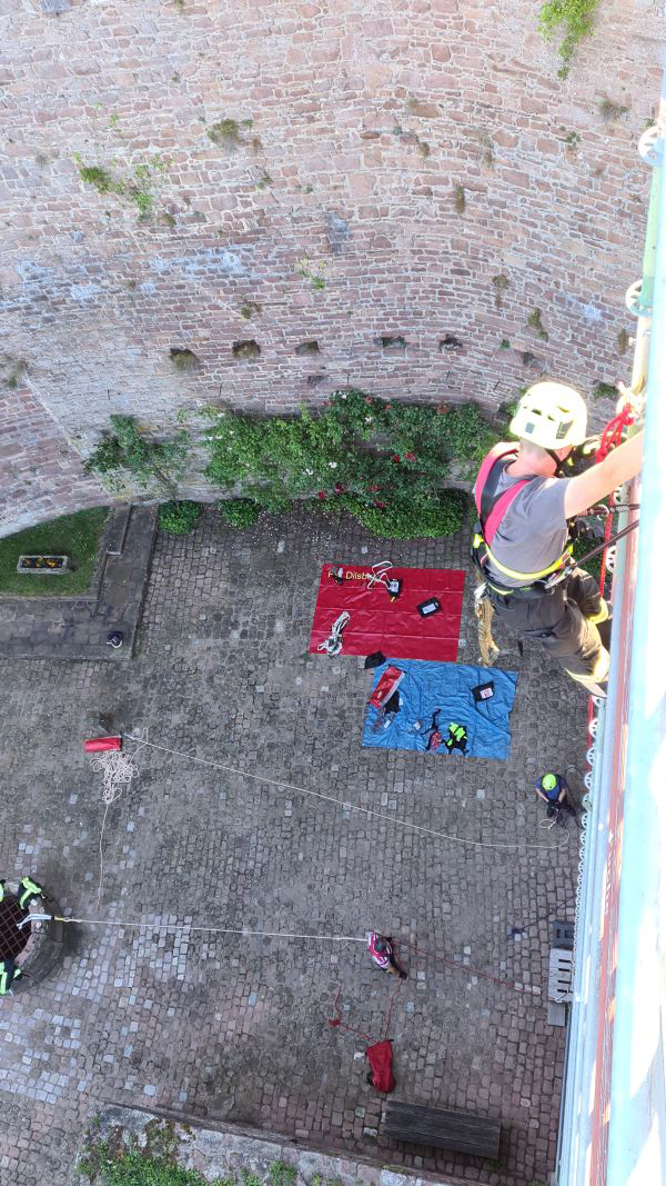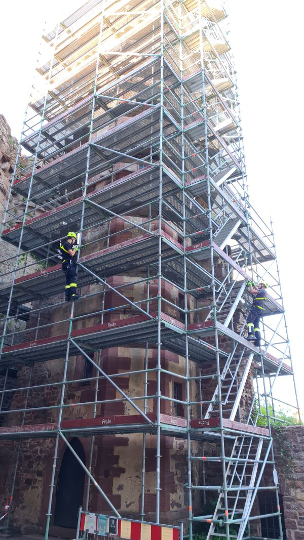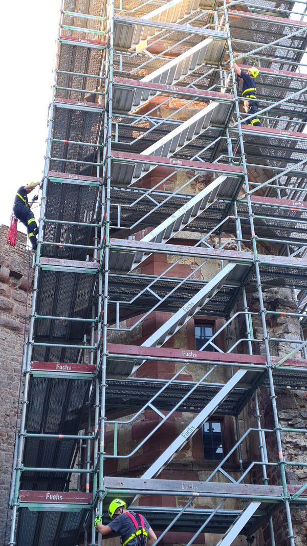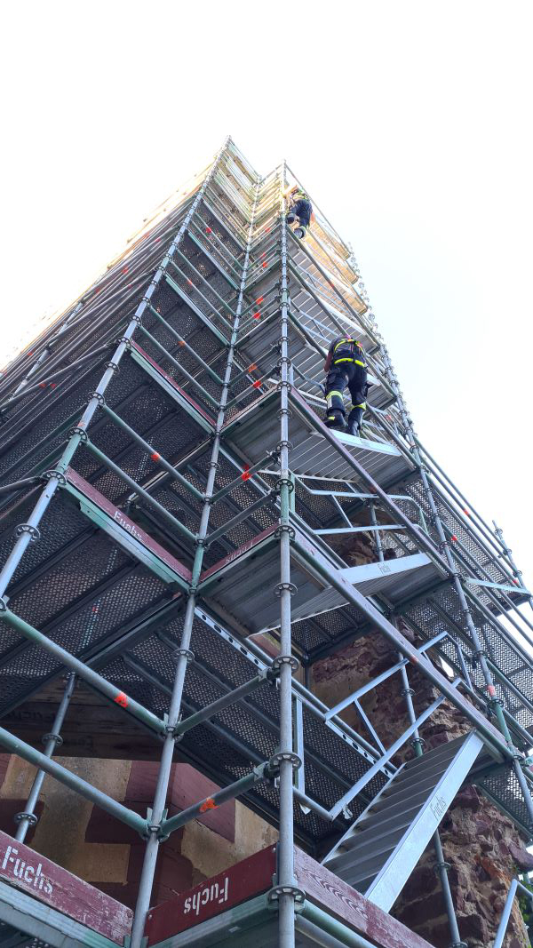 An einem Baugerüst übte die Gruppe Absturzsicherung den sicheren Vorstieg mit verschiedenen Praktiken.