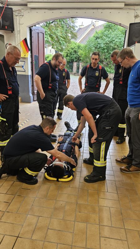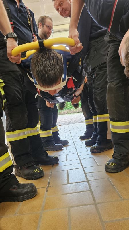Bei unserer heutigen Übung hatten wir wieder Besuch von unserem befreundeten Arzt Jan Stiepak. Wir befassten uns heute intensiv mit den verschiedenen Tragen, die wir auf unserem Löschfahrzeug führen (Schleifkorbtrage, SpineBoard, Tragetuch sowie auch der Norm-Krankentrage des Katatrophenschutzes), stellten Vor-und Nachteile in verschiedenen Situationen und Bereichen fest und übten den Patienten richtig zu lagern und auf den Tragen zu fixieren.