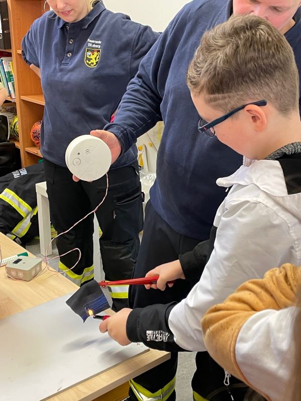 Hier wurde in Rollenspielen das Absetzen eines Notrufes geübt, es wurde die persönliche Schutzausrüstung eines Feuerwehrangehörigen erklärt und die Kinder konnten in praktischen Versuchen sehen, wie sich verschiedene Stoffe von Kleidungsstücken im Kontakt mit Feuer verhalten.