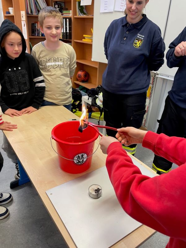 Zur Großen Pause wurde dann wieder, wie jedes Jahr, die Fettexplosion für alle Schülerinnen und Schüler der Grundschule vorgeführt. Hier machten die Kinder große Augen als sie sahen, was passiert, wenn man ca. 150ml Wasser in einen Topf mit brennendem Fett kippt. Bei dieser Vorführung wurde nochmal allen bewusst, wieso man brennendes Fett niemals mit Wasser löschen darf.